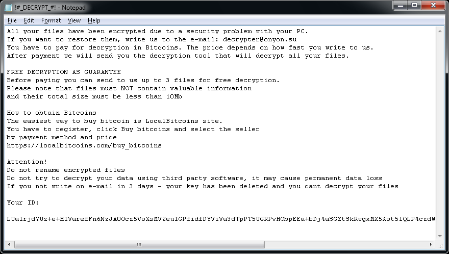 Зашифрованные файлы получают одно из следующих расширений: .kkk, .btc, .gws, .J, .encrypted, .porno, .payransom, .pornoransom, .epic, .xyz, .versiegelt, .encrypted, .payb, .pays, .payms, .paymds, .paymts, .paymst, .payrms, .payrmts, .paymrts, .paybtcs, .fun, .hush, .uk-dealer@sigaint.org или .gefickt.