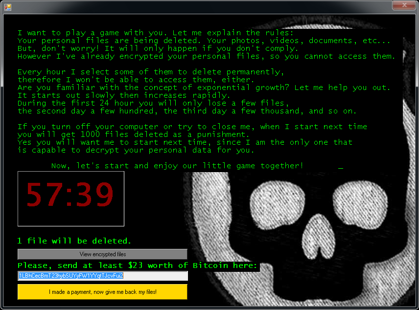 Зашифровав ваши файлы, программа Legion меняет фон рабочего стола, при этом появляется всплывающее окно, аналогичное этому: