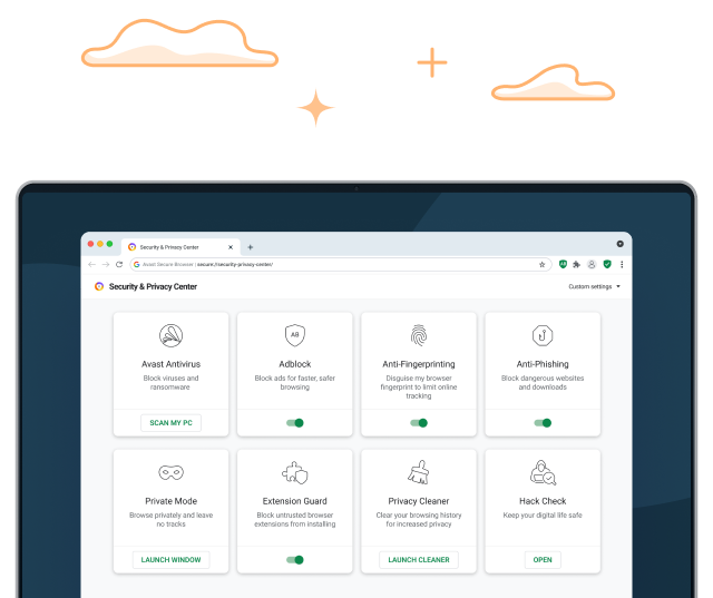 Налаштувати Avast Secure Browser просто. Усі вбудовані інструменти безпеки та конфіденційності готові до роботи з моменту запуску браузера. Ними можна без особливих зусиль керувати через нашу зручну сторінку налаштувань. Крім того, браузер Avast Secure Browser сумісний з іншими додатковими модулями для Chrome, тож ви зможете налаштувати перегляд сайтів відповідно до своїх потреб за допомогою вебмагазину Chrome.
